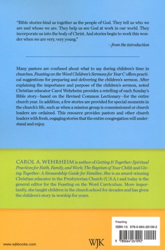 Many pastors are confused about what to say during children's time in churches. Feasting on the Word Children's Sermons for Year C offers practical suggestions for preparing and delivering the children's sermon. After explaining the purpose of the children's sermon, noted Christian educator Carol Wehrheim provides a story for each Sunday of the church year based on the Revised Common Lectionary. In addition, a few stories are provided for special moments in the church's life, such as when a mission group is commissioned, church leaders ordained, a death occurs. This resource provides pastors and other church leaders with fresh, engaging stories that children will understand and enjoy.
