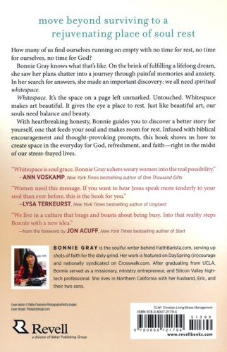 Spiritual whitespace makes room–room in one's heart for a deep relationship with God, room in one's life for rest, room in one's soul for rejuvenation. With soul-stirring vulnerability and heartbreaking honesty, Bonnie takes readers on a personal journey to feed their souls and uncover the deeper story of rest. Lyrical writing draws readers into Gray's intimate journey through overwhelming stress to find God in a broken story and celebrate the beauty of faith.