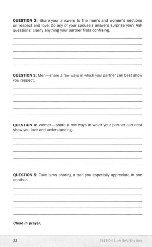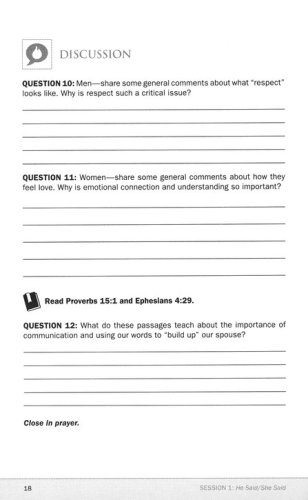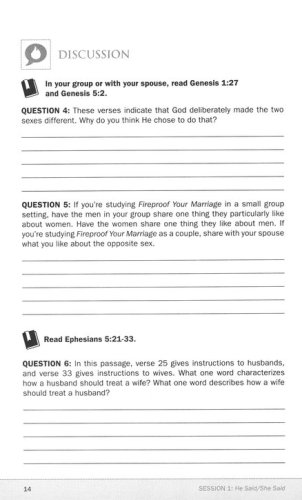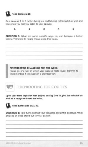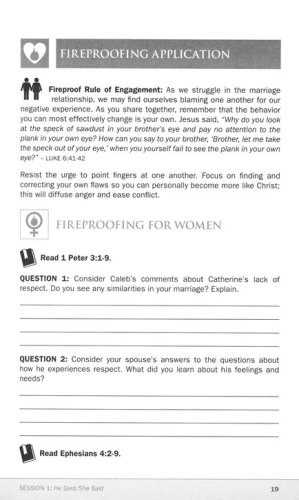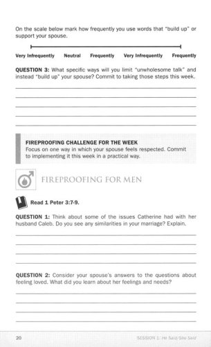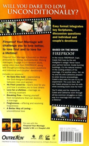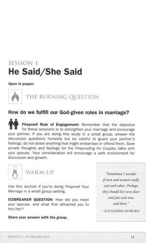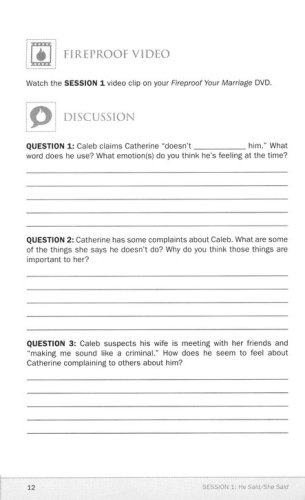 The Fireproof Your Marriage Participant's Guide is founded on Biblical principles for strong, God-centered, marriages. With the Participant's Guides couples engage in a 6-session study with an easy format that integrates key Scriptures, group discussion and individual and couple's devotions. The Participant's Guide coordinates with the Fireproof Your Marriage Small Group Leader's Kit & DVD, the Couples' Kit and the Fireproof Your Marriage sermons. Can be used with or without the movie.