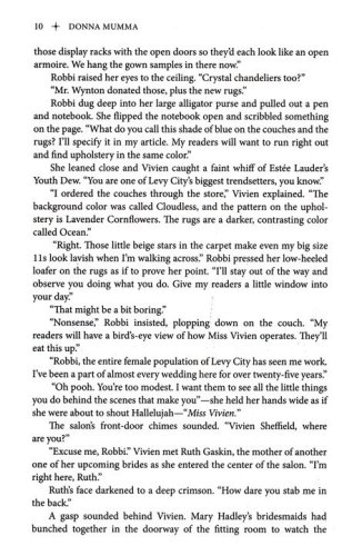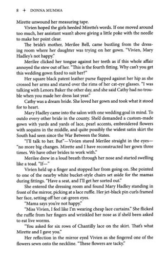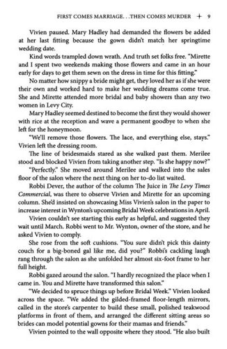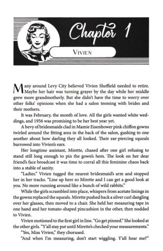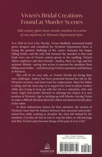 It is 1956 in Levi City, Florida. Vivien Sheffield, renowned bridal gown designer and consultant for Wynton’s Department Store, is facing the greatest challenge of her career. Someone has been killing brides who wore one of her custom gowns in their wedding! Vivien’s fellow employees and close friends—Audrey, Mary Jo, and Gigi—and her assistant Mirette spring into action to save Miss Vivien and the young brides of Levy City before the murderer succeeds at destroying Vivien’s business at Wynton’s. . .and her reputation.
