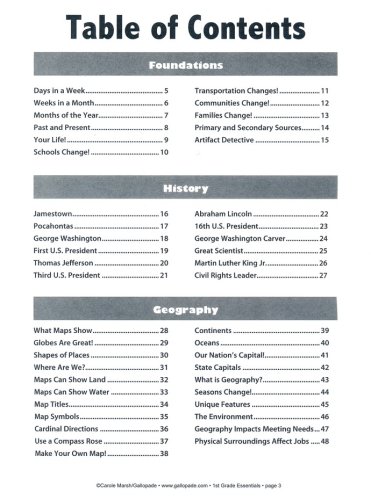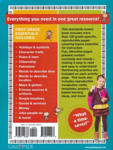 Have fun teaching social studies to your first grade class with this book of almost 100 reproducible activity pages. Worksheets also include hands-on learning opportunity templates, graphic organizers, writing prompts, project-based learning ideas, and vocabulary cards with definitions that you can cut out. History, geography, economics, civics, and basic concepts like days, months, communities, and transportation are covered. 128 pages, softcover. Reproducible. Grade 1.