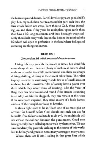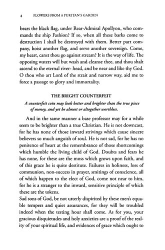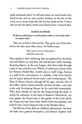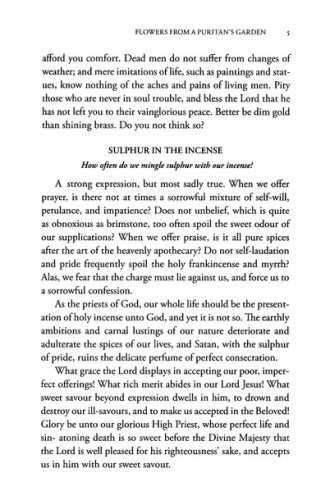 To Manton's thoughts, Spurgeon added his own; the result being, as Spurgeon put it, that he cleared Manton's house of all his pictures, and then hung them up in frames of his own. These newly framed pictures are exhibited in Flowers From a Puritan's Garden, which Spurgeon intended to be used as an aid to meditation and prayer. Preachers will also find inspiration in these Manton-Spurgeon combinations for sensible and clear sermon illustrations.