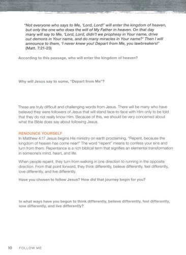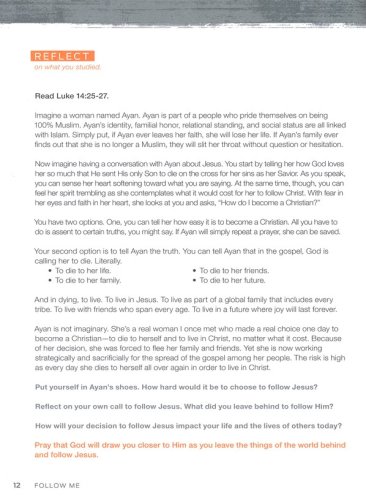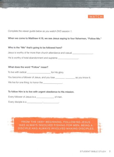 Follow Me Student Bible Study, based on David Platt’s book Follow Me, is a short-term, video-enhanced study for all youth, grades 7 to 12. "Follow Me." Christ’s command has been examined time and again, but have we lost sight of its meaning? Based on David Platt's book Follow Me, this video-enhanced study will guide students to an understanding of Jesus' call to deny self and live with an unwavering devotion to Him. In the end, a picture of real discipleship will be clearer along with a challenge to not only follow Christ but also to make disciples for His kingdom.