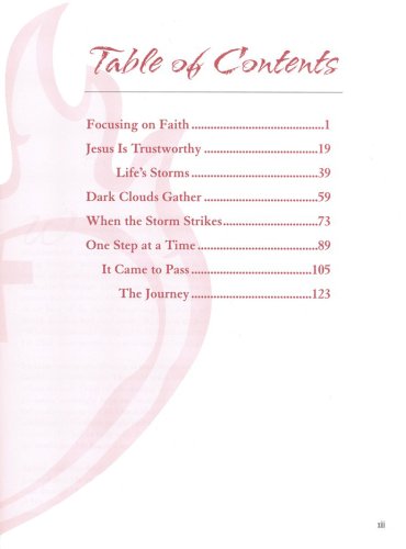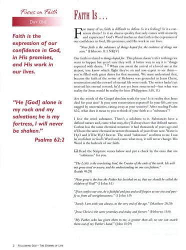 Life Principles for the Storms of Life is an eight-week Following God Bible study that leads women through dark days using the analogy of a storm: preparing as the clouds gather, walking through the intense storm, and picking up the pieces after the crisis has passed. readers will apply God's Word to their difficult situations, allow them to resolve anger and bitterness. Finally, they will be encouraged to find strength in Scripture, challenged to seek God's purpose and perspective in a time to suffering, and inspired to draw close to Him for strength and healing.
