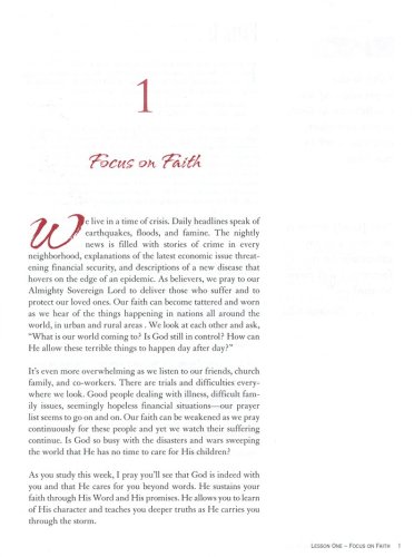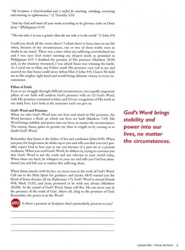 Women will discover indisputable truths that remain unchanged by their difficult situations, allowing then to resolve anger and bitterness. They will be encouraged to find strength in Scripture, challenged to seek God's purpose and perspective in a time of suffering to draw close to Him for strength for healing