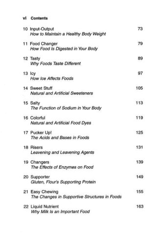 Kids can learn about leavening agents by mixing baking soda withvinegar. They'll explore why different sweeteners vary insweetness, how to use natural food dyes to dye a T-shirt, and whatthe food pyramid is-plus much more.