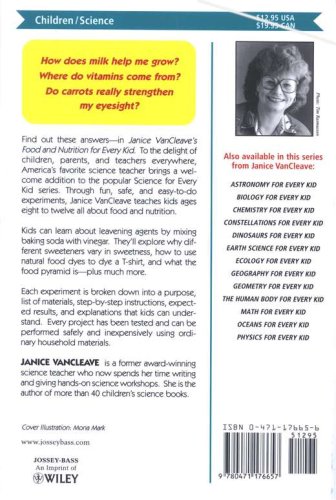 Find out these answers-in Janice VanCleave's Food and Nutrition forEvery Kid. To the delight of children, parents, and teacherseverywhere, America's favorite science teacher brings a welcomeaddition to the popular Science for Every Kid series. Through fun,safe, and easy-to-do experiments, Janice VanCleave teaches kidsages eight to twelve all about food and nutrition.