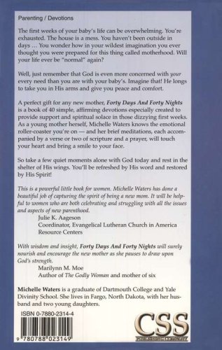 Forty Days And Forty Nights by Michelle Waters is bible devotion book with Christian devotionals. Here are some of the topics covered in this bible devotion book: – Daily devotions- Christian daily devotions- Christian devotions- Bible devotions- Daily devotions- Christian devotionals- Devotions for women- Spiritual devotions for womenThe first weeks of your baby's life can be overwhelming. You're exhausted. The house is a mess. You haven't been outside in days ? You wonder how in your wildest imagination you ever thought you were prepared for this thing called motherhood. Will your life ever be "normal" again?Well, just remember that God is even more concerned with your every need than you are with your baby's. Imagine that He longs to take you in His arms and give you peace and comfort.A perfect gift for any new mother, Forty Days And Forty Nights is a book of 40 simple, affirming Christian devotions especially created to provide support and spiritual solace in those dizzying first weeks. As a young mother herself, Michelle Waters knows the emotional roller-coaster you're on – and her brief meditations, each accompanied by a verse or two of scripture and a prayer, will touch your heart and bring a smile to your face.So take a few quiet moments alone with God today and rest in the shelter of His wings. You'll be refreshed by His word and restored by His Spirit This is a powerful little book for women. Michelle Waters has done a beautiful job of capturing the spirit of being a new mom. It will be helpful to women who are both celebrating and struggling with all the issues and aspects of new parenthood.Julie K. AagesonCoordinator, Evangelical Lutheran Church in America Resource CentersWith wisdom and insight, Forty Days And Forty Nights will surely nourish and encourage the new mother as she pauses to draw upon God's strength.Marilynn M. MoeAuthor of The Godly Woman and mother of sixMichelle Waters is a graduate of Dartmouth College and Yale Divinity School. She lives in Fargo, North Dakota, with her husband and two young daughters. She is also the author of Through the Clouds, a Christian devotional book for new moms.Forty Days and Forty Nights is a bible devotion book with Christian devotionals covering topics such as daily devotions, Christian daily devotions, Christian devotionals, bible devotions, devotions for women, and spiritual devotions for women.
