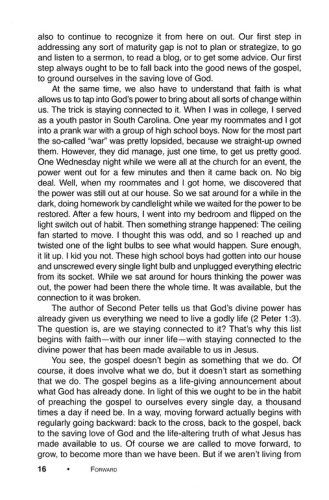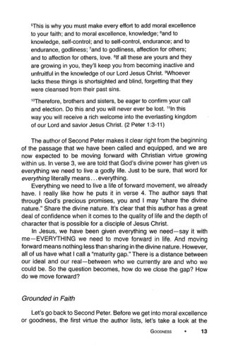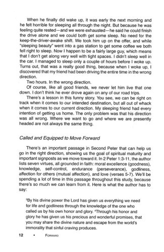 Study 2 Peter 1:3-11 and the virtues lifted up in this passage: Moral excellence, knowledge, self-control, endurance, godliness, affection for others, and love. There is a strong focus on actively pursuing a godly life…it's not just resistance to sin that matters, but an active pursuit of goodness and love, fully living into the new life that Christ offers believers. Forward helps Christ-centered small groups take the next step. They learn how to push one another forward in their shared life together. Pushing one another forward means helping one another grow in faith, knowledge, and actions consistent with a Christian life.