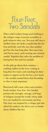 Four Feet, Two Sandals was inspired by a refugee girl who asked the authors why there were no books about children like her. With warm colors and sensitive brush strokes, this book portrays the strength, courage, and hope of refugees around the world, whose daily existence is marked by uncertainty and fear.