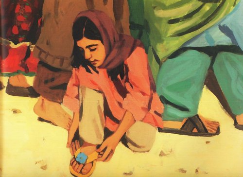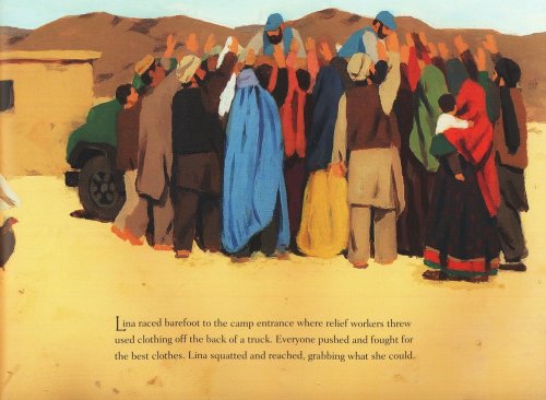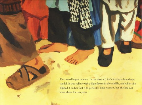 When relief workers bring used clothing to the refugee camp, everyone scrambles to grab whatever they can. Ten-year-old Lina is thrilled when she finds a sandal that fits her foot perfectly, until she sees that another girl has the matching shoe. But soon Lina and Feroza meet and decide that it is better to share the sandals than for each to wear only one.