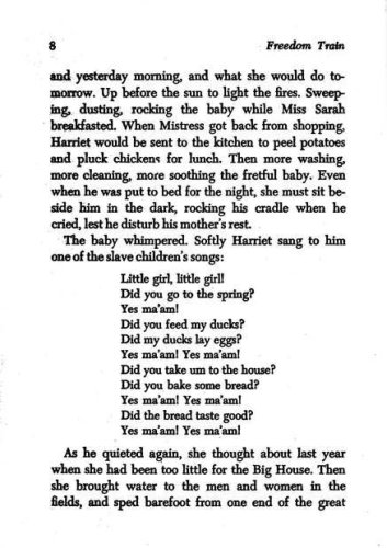Born into slavery, young Harriet Tubman knew only hard work and hunger. Escape seemed impossible – certainly dangerous. Yet Harriet did escape North, by the secret route called the Underground Railroad. Harriet didn't forget her people. Again and again she risked her life to lead them on the same secret, dangerous journey.