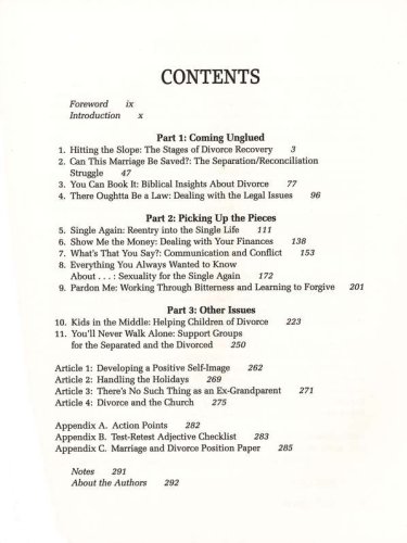 The Bible-based insights included in this revised and updated edition will give you the practical tools you need to recover from the trauma of divorce and complete the journey toward wholeness after the painful breakup of a marriage. Questions, self-tests, excercises, and practical information will enable you to: