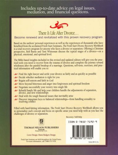 Filled with hard-hitting information, The Fresh Start Divorce Recovery Workbook allows you to personalize each concept and focus on specific areas you need help with as you face the challenges of divorce or separation.