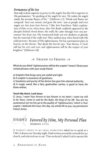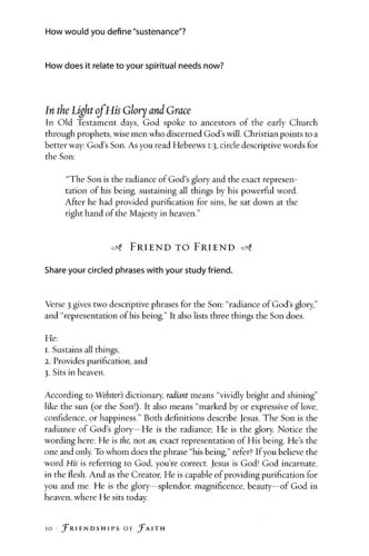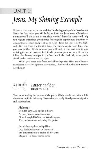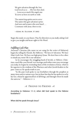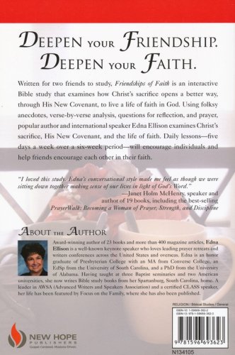Written for two friends to study and experience together, Friendships of Faith: A Shared Study of Hebrews is an interactive Bible study that examines how Christ's sacrifice opens a better way, through His New Covenant, to live a life of faith in God. Friendships of Faith is a straightforward study of the most basic tenets of the Christian faith as outlined in the Book of Hebrews. Using folksy anecdotes, verse-by-verse analysis, questions for reflection and prayers, author Edna Ellison examines Christ's sacrifice, His New Covenant, and the life of faith. Daily lessons—five days a week over a six-week period—will encourage individuals and help friends encourage each other in their faith.