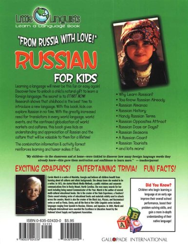 Learning a language will never be this fun or easy again! Research shows that childhood is the best time to introduce a new language. With the greatly increased need for translators in every world language, world events and the continued globalization of world markets and cultures. This book gives kids and understanding and appreciation of Russian and the culture that will be valuable to them for a lifetime! The combination of information and activity format reinforces learning and humor, making it fun and easy for kids to explore Russian. This introduction to the language uses Romanized letters. Sentences provide the context for kids to figure out what italicized words mean. Answers in back, 32 pages with achievement certificate.