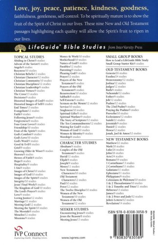 Love, joy, peace, patience, kindness, goodness, faithfulness, gentleness, self-control. To be spiritually mature is to show the fruit of the Spirit of Christ in our lives. These nine-session LifeGuide ® studies from Old and New Testament passages highlight each quality and inspire us to nurture the Spirit's fruit in our lives. For over three decades LifeGuide Bible Studies have provided solid biblical content and raised thought-provoking questions—making for a one-of-a-kind Bible study experience for individuals and groups. This series has more than 130 titles on Old and New Testament books, character studies, and topical studies.