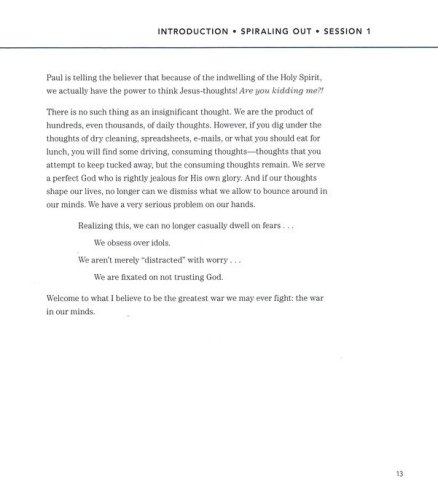 Taking every thought captive to make it obedient to ChristShifting the focus of our minds from our circumstances to GodFighting toxic thoughts with weapons of humility, silence, and delightEscaping our comfort zones with weapons of connection, intentionality and gratitudeLearning to forget what's behind so we can move aheadDefeating anxiety with a mind like Christ's