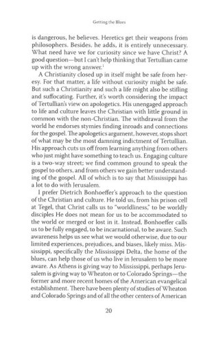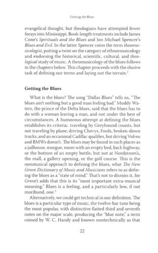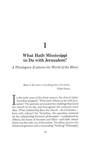 This book attempts a theology in a minor key, a theology that lingers, however uncomfortably, over Good Friday. It takes its cue from the blues, harmonizing narratives of Scripture with narratives of the Mississippi Delta, the land of cotton fields and Cyprus swamps and the moaning slide guitar. This is not a book by a musician, however, but by a theologian. And so I offer a theological interpretation of the blues. Cambridge theologian Jeremy Begbie has argued for music's intrinsic ability to teach theology. As an improvisation on Begbie's thesis, I take the blues to be intrinsically suited to teach a particular theology, a theology in a minor key. This is not to suggest that a theology in a minor key, or the blues for that matter, utterly sounds out despair like the torrents of a spinning hurricane. A theology in a minor key is no mere existential scream. In fact, a theology in a minor key sounds a rather hopeful melody. Good Friday yearns for Easter, and eventually Easter comes. Blues singers, even when groaning of the worst of times, know to cry out for mercy because they know that, despite appearances, Sunday's coming. . . . The blues, like the writings of Flannery O'Connor, need not mention him [Christ] in every line, or in every song, but he haunts the music just the same. At the end of the day, he serves as the resolution to the conflict churning throughout the blues, the conflict that keeps the music surging like the floodwaters of the Mississippi River.