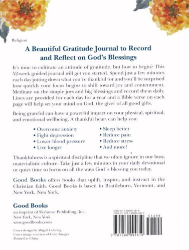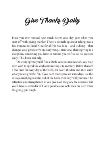 It's time to cultivate an attitude of gratitude, but how to begin? This 52-week guided journal will get you started. Spend just a few minutes each day jotting down what you're thankful for and you'll be surprised how quickly your focus begins to shift toward joy and contentment. Meditate on the simple joys and big blessings and record them daily. Lines are provided for each day for a year and a Bible verse on each page will help set your mind on God, the giver of all good gifts.
