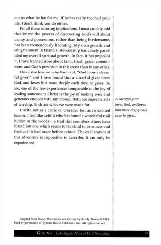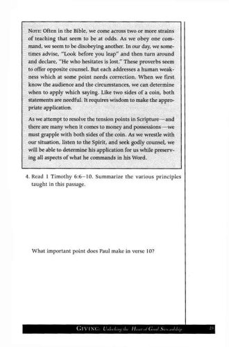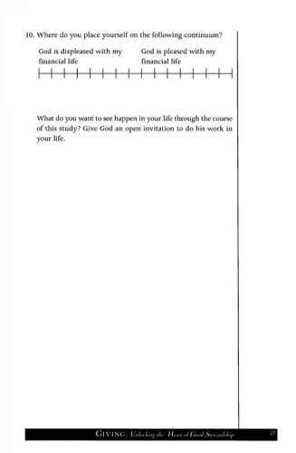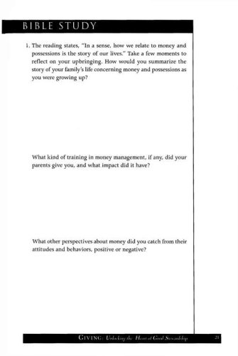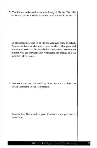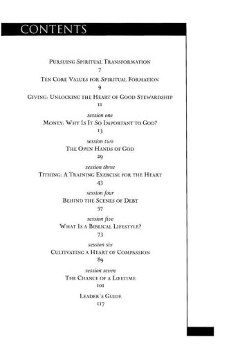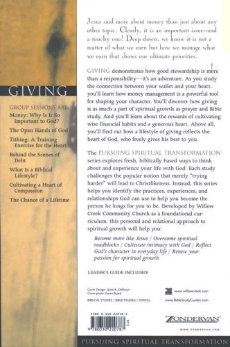 Jesus said more about money than just about any other topic. Clearly, it is an important issue–and a touchy one! Deep down, we know it is not a matter of what we earn but how we manage what we earn that shows our ultimate priorities.Giving demonstrates how good stewardship is more than a responsibility—it’s an adventure. As you study the connection between your wallet and your heart, you’ll learn how money management is a powerful tool for shaping your character. You’ll discover how giving is as much a part of spiritual growth as prayer and Bible study. And you’ll learn about the rewards of cultivating wise financial habits and a generous heart. Above all, you’ll find out how a lifestyle of giving reflects the heart of God, who freely gives his best to you.Leader’s guide included!Giving group sessions are:Money: Why Is It So Important to God?The Open Hands of GodTithing: A Training Exercise for the HeartBehind the Scenes of DebtWhat Is a Biblical Lifestyle?Cultivating a Heart of CompassionThe Chance of a Lifetime