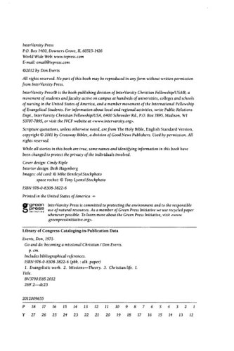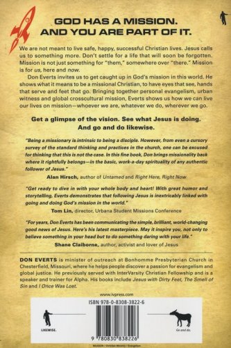 We are not meant to live safe, happy, successful Christian lives. Jesus calls us to something more. Don't settle for a life that will soon be forgotten. Mission is not just something for "them," somewhere over "there." Mission is for us, here and now. Don Everts invites you to get caught up in God's mission in this world. He shows what it means to be a missional Christian, to have eyes that see, hands that serve and feet that go. Bringing together personal evangelism, urban witness and global crosscultural mission, Everts shows how you can live your life on mission–whoever you are, whatever you do, wherever you go. Get a glimpse of the vision. See what Jesus is doing. And go and do likewise.