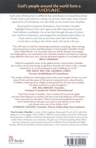God's people around the world form a mosaic. Each piece of the picture is different but contributes to a beautiful portrait of who God is and what he is doing among his creation. As you learn from these many cultural expressions of Christianity, your own faith will be made more complete. Drawing from scriptural illustrations, Paul-Gordon Chandler highlights cultural themes and tells inspirational stories from believers around the world. Ranging from the streets of Hong Kong to the shores of a village in Guatemala, these stories illuminate each region's culture and history. You'll be drawn into the mystery of God with Christians in Eastern Europe. You'll learn perseverance from fellow believers in the Middle East. Latin American churches exuberantly share joy in Christ. And brothers and sisters in Africa, Asia and India also open their hearts to help you understand God from their point of view. As you begin to see God through the eyes of other Christians, new windows of devotion, encouragement and growth open. And you will see God–a God who is as big as the whole world–as you have never seen him before.