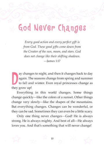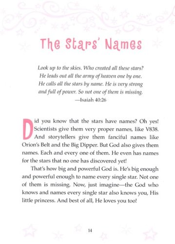 includes a Bible Scripture, a short reading, a rhyming prayer, and a quiet activityrelates God's truth in a simple way that 4- to 7-year-olds can relate toencourages family discussionsincludes illustrations of puppies, dress-up, flowers, and other sweet things girls adorewill send every little princess off to bed full of smiles and feeling loved and secure