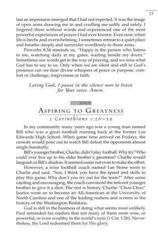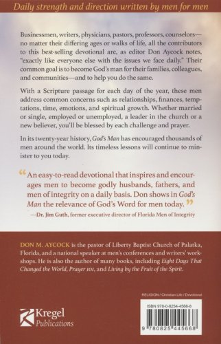 In this best-selling daily devotional, the contributors include businessmen, writers, pastors, professors, and counselors. Some were retired, some were middle-aged, and some were only beginning their careers when they penned these words. Despite their differences, editor Don Aycock rightly notes, "We are exactly like everyone else with the issues we face daily," Their common goal here is to become God's man for their families, colleagues, and communities–and to help reader do the same.