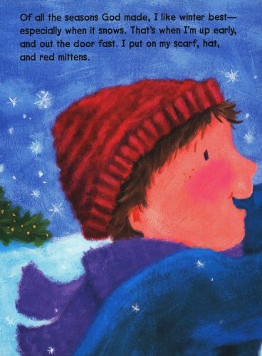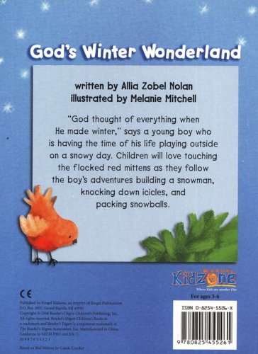 Wearing his hat, scarf, and fuzzy red mittens, a young boy frolics in a winter wonderland. He delights in playing in the snow, building a snowman, licking icicles, and throwing snowballs. In this delightful book about God's winter days, fuzzy red mittens on every page make winter fun as children learn about God's snowy creation.