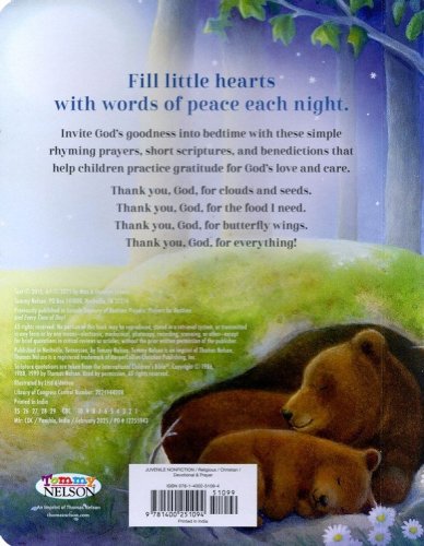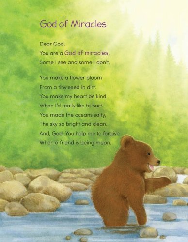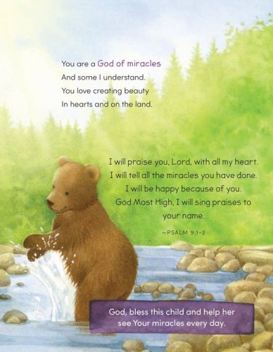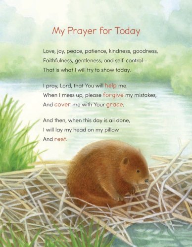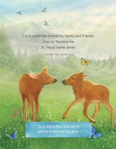 original prayers that speak to the unique challenges and joys of little ones,prayers from the Bible that small children can understand,a heartfelt note to parents about the readiness of a child’s heart for prayer,a "God bless this child" benediction on every page for parents to pray over their children, andcalming nature scenes of animal families.