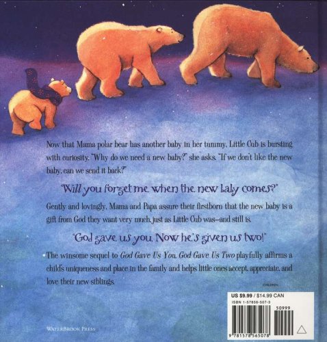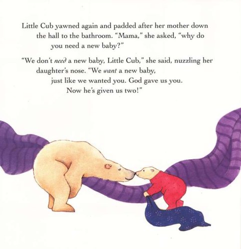 Gently and lovingly, Mama and Papa assure their firstborn that the new baby is a gift from God they want very much, just as Little Cub was–and still is. "God gave us you. Now he’s given us two!"