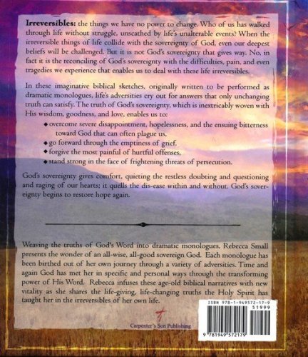 Weaving the truths of God's Word into dramatic monologues, Rebecca Small presents the wonder of an all-wise, all-good sovereign God. Each monologue has been birthed out of her own journey through a variety of adversities. Time and again God has met her in specific and personal ways through the transforming power of His Word. Rebecca infuses these age-old biblical narratives with new vitality as she shares the life-giving, life-changing truths the Holy Spirit has taught her in the irreversibles of her own life.
