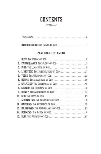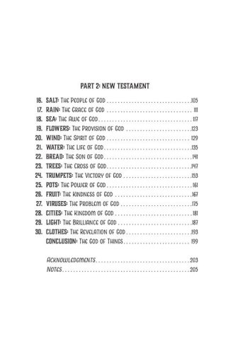 Dust: the image of GodHorns: the salvation of GodDonkeys: the peace of GodWater: the life of GodViruses: the problem of GodCities: the kingdom of God