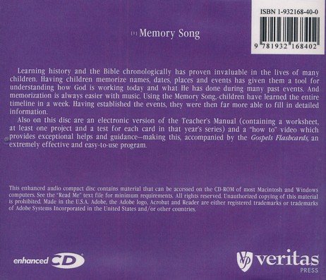 This "School Teacher's Manual Enhanced CD" is part of the Veritas Press Bible Series Gospels. It includes not only the Gospels timeline memory song, but also an electronic version of the Teacher's Manual (which includes a worksheet, at least one project, and a test for each card in that year's series) and a "how to" video which provides helps and guidance. Enhanced materials are in Adobe Acrobat format and can be accessed on the CD-ROM of most Macintosh and Windows computers. Grade 5.