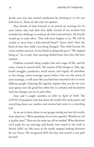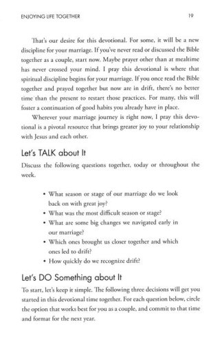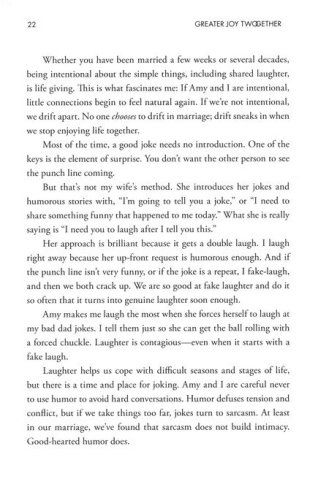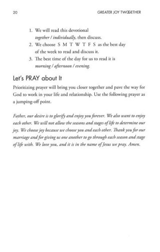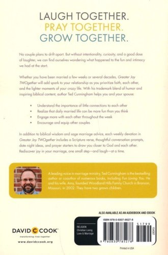 Do you and your spouse feel more like roommates than a married couple? Greater Joy TWOgether will help you go deep in your faith, nurture your marriage, and make laughter a part of your everyday life. Each weekly devotion includes a short reading, a Scripture verse, conversation prompts, ideas for putting the week’s theme into action, and prayer starters to draw you closer to God and each other.