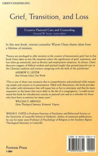 In Grief, Transition, and Loss, author Wayne Oates calls Christian caregivers to the task of attending to people facing moments of emergency and crisis. Throughout the book Oates draws on his own experiences of loss, and his extensive work with grieving people to build a theological and biblical understanding of the ways in which people encounter challenging times. The book covers a variety of losses–illness, death, separation and divorce, and even a range of work related issues–with sensitivity and grace, and equips caregivers with the tools needed to respond in helpful and lifegiving ways.