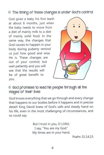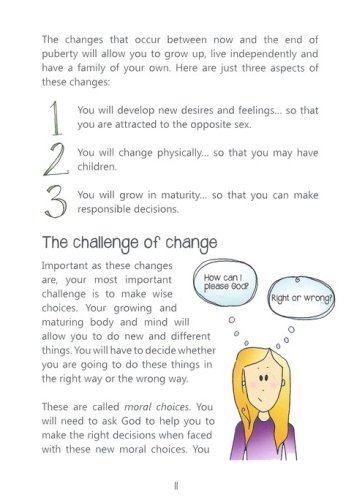 Growing up God’s way forGirls is a colourful, fully illustrated book available as separate versions for boys and girls. It is intended for children approaching or experiencing puberty, typically represented by the 10-14 years old age range. The artwork haas been specially produced for the book and includes accurate biological drawings as well as ‘cartoon’ illustrations to keep the young reader interested. Most importantly of all, the Bible is the constant reference point, so that what the Bible has to say about the matters dealt with is always front and centre. The result is that this book conveys essential biblical ethical teaching as well as the facts about puberty. For example, here’s an extract from the teaching on the chapter on ‘Physical Intimacy’ (in this case in the girls version): So special that God has given us rules It might seem attractive to live in a world where there are no laws. (Of course it would mean that your parents would never be able to tell you that you were doing something wrong!) But have you ever thought what would happen if there were no laws about how we should drive a car? The laws of the road make it safe for us to drive. If there were none, many more people on the road would get injured and driving would be a very frightening experience. God has given us a law regarding how we relate to the opposite sex in sexual intimacy. This law is the seventh of the Ten Commandments: ‘You shall not commit adultery’ (Exodus 20:14). From this verse and other passages in the Bible, we learn that all sexual activity outside marriage is wrong. The word adultery means either being married and experiencing sexual intimacy with someone who is not your husband, or experiencing sexual intimacy with someone else’s husband. In the New Testament, God warns us to ‘flee from sexual immorality’ (1 Corinthians 6:18). The term ‘sexual immorality’ includes any sexual activity that is not between a husband and his wife. The fact that God has given us a specific command to keep sexual intimacy for marriage shows how important God considers sexual intimacy to be. The husband and wife are important to Him, their marriage is important to Him, and the new life that may result from sexual intimacy is important to Him. God’s law about sexual intimacy is for our safety and well-being – it protects us, it protects marriage, and it protects young life.