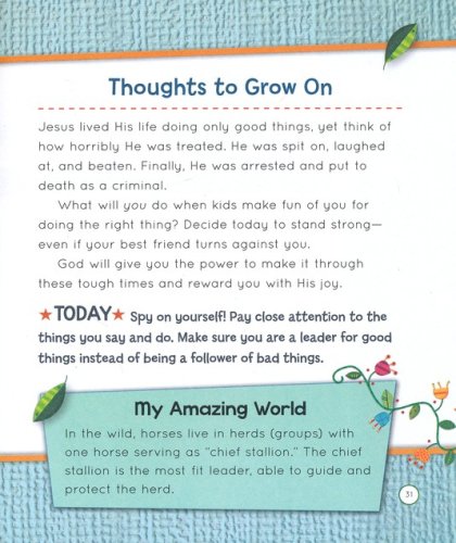 Each of these 100 short devotionals offers a Bible verse, a “Thought to Grow On” devotion, and a challenge that will help kids connect to God and build a relationship with Him. God’s creation is magnified through amazing facts about the world and the unique way God makes each child.