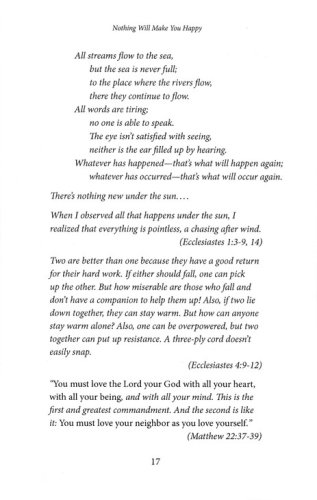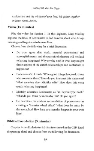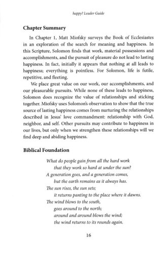 We all dream of being happy. If we could just lose the extra weight, get the job, buy the house, we could truly be happy. But over time, it begins to seem as though lasting happiness is unattainable. Despite our best efforts, true happiness will never be a reality for us. So how do we find lasting happiness and contentment in our lives? Maybe the answer isn’t in our own lives at all. Matt Miofsky connects the existential question, "Am I happy?", with basic theology and unexpected biblical texts. Starting with the book of Ecclesiastes, considering if any "thing" can make us happy, he explores the value of relationships, a forgiving lifestyle, living in the present, feeling gratitude, and learning to release control. The Leader Guide contains everything needed to guide a group through the 4-week study including session plans and discussion questions, as well as multiple format options.