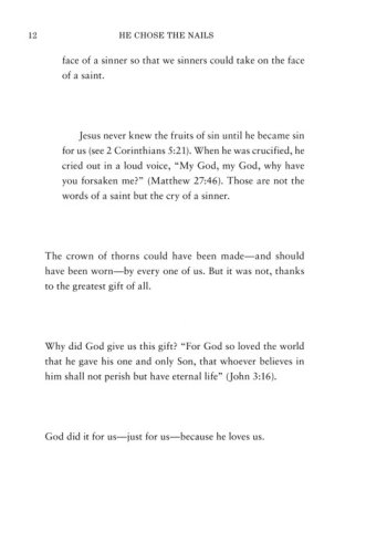 In He Chose the Nails, Max Lucado observes that the last moments leading up to Jesus’ death were not left up to chance. God chose the path; he selected the nails. Our Lord planted the trio of crosses and painted the sign. God was never more sovereign than in the details of the death of his Son. And in those details are gifts Christ provided for us…the cross. The thorns. The nails. His seamless robe. The empty tomb.