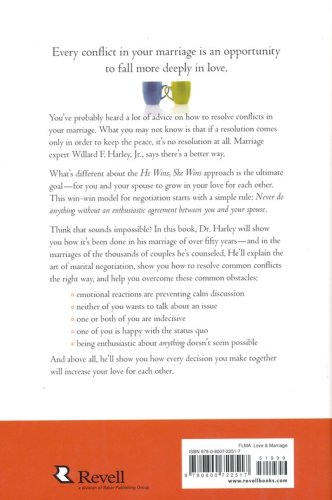 In He Wins, She Wins, Dr. Harley introduces the revolutionary concept of joint agreement in marriage that keeps both husband and wife on equal footing and equally satisfied. This win-win model for negotiation starts with a simple rule: Never do anything without enthusiastic agreement between you and your spouse. Dr. Harley walks couples through the five most common sources of conflict in marriage, (friends and family, career and time management, finances, children, and sex), applying the joint agreement rule in every situation. And he teaches readers how to resolve conflicts the right way, so that not only are those conflicts resolved once and for all but the couple's love for one another actually grows and is sustained for the rest of their lives.