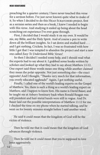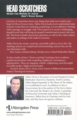 Sometimes Jesus says things that make you scratch your head. Much of what Jesus has to say is uplifting or inspiring. But let’s face it: Sometimes Jesus says things that are confusing, perplexing, or even offensive. In Head Scratchers, Talbot Davis leads you to understand some of these difficult words. In each chapter, he examines a different statement or brief teaching from Jesus, using the provided biblical and other background to help illuminate the passage in question. Davis not only guides you to understand the passage, but shows you what it means to take it to heart and embrace a new way of life as a result. Starting with a passage we struggle with, Davis opens it to reveal a challenging, hopeful word that will bring the gospel’s transformative power into your life.