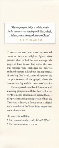 This intimate work, a compilation of articles that spans Billy's ministry from 1955 to 2014, invites you to sit down with Billy and hear in his own unvarnished words the things that moved his heart regarding relevant issues of the day. The Biblical convictions he abided by. The reasons and regrets behind some of his decisions. And the wisdom he gained in his century on this earth.