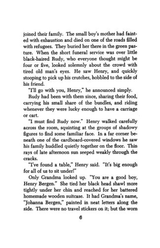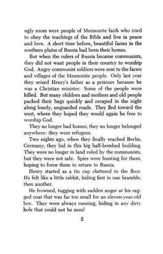 Barbara Smucker relates the dramatic and courageous story of refugees from Russia. This is a story of suspense–American soldiers, Russian officers, and a midnight train ride in darkened boxcars. An actual event that happened in Berlin in 1946. 120 pages.
