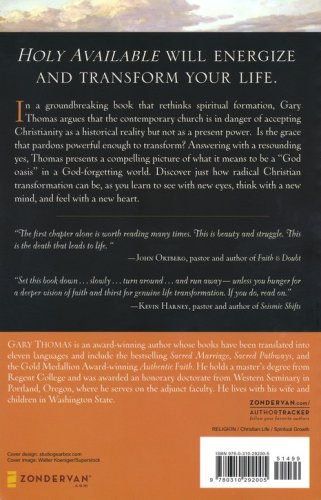 True Christian faith is a profoundly transformational experience in which every part of our being is marked by God’s change and energized by his presence. This transformation takes us far beyond mere sin avoidance to a robust “full-bodied” holiness in which we make ourselves “holy available” to God every minute of the day. From Starbucks, to the office, to the soccer fields, to the boardroom, believers have the opportunity to carry the presence of Christ wherever they go. God offers the reader more than mere forgiveness; he wants to radically change and fill them with his presence, so they can experience an entirely different kind of life based not just on what they do or don’t do but on who they are.Yet while many Christians today profess belief, their Christianity has no pulse. Holy Available is a manifesto of fully alive faith. Gary Thomas issues a compelling call for readers to see with Christ’s eyes, feel with Christ’s heart, and serve with Christ’s hands. We make ourselves available to become “God oases,” places of spiritual refuge where God can bring the hurting and lost to enjoy his presence and ministry.