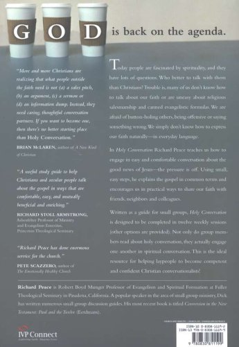 God is back on the agenda. Today people are fascinated by spirituality, and they have lots of questions. Who better to talk with them than Christians? Trouble is, many of us don't know how to talk about our faith or are uneasy about religious salesmanship and canned evangelistic formulas. We are afraid of button-holing others, being offensive or saying something wrong. We simply don't know how to express our faith naturally–in everyday language. In Holy Conversation Richard Peace teaches us how to engage in easy and comfortable conversation about the good news of Jesus–the pressure is off. Using small, easy steps, he explains the gospel in plain language and encourages us in practical ways to share our faith with friends, neighbors and colleagues. Written as a guide for small groups, Holy Conversation is designed to be completed in twelve weekly sessions (other options are provided). Not only do group members read about holy conversation, they actually engage one another in spiritual conversation. This is the ideal resource for helping laypeople to become competent and confident Christian conversationalists!