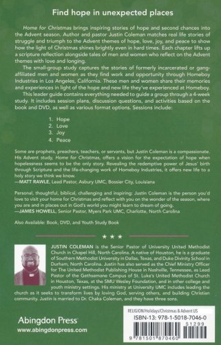 Home for Christmas brings inspiring stories of hope and second chances into the Advent season. Author and pastor Justin Coleman matches real life stories of struggle and triumph to the Advent themes of hope, love, joy, and peace to show how the light of Christmas shines brightly even in hard times. Each chapter lifts up a scripture reflection alongside tales of men and women who reflect on the Advent themes with love and longing.