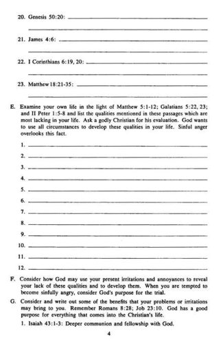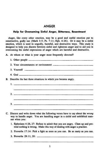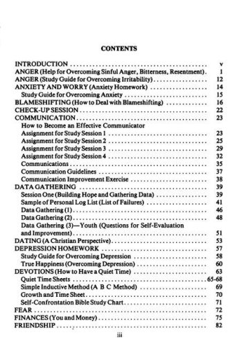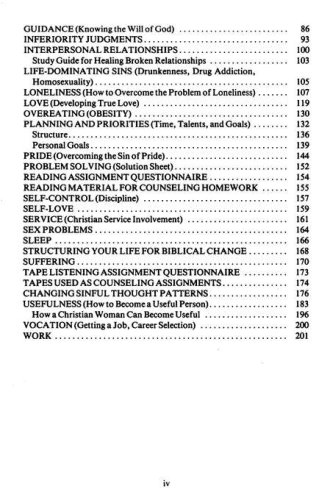 This book gives specific assignments for counselors to assign to clients or for counselors to work through to gain insight. Topics include: anger, blame shifting, dating, obesity, pride, sex, sleep, work—and many others. It is a staple title for counseling ministries.