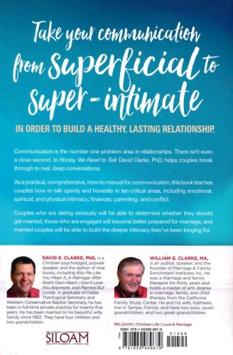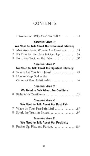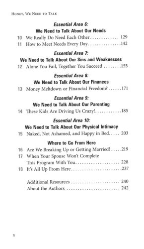 In an intensely practical, workbook style Honey, We Need to Talk will guide you through each of these ten essential areas: Emotional intimacySpiritual intimacyConflictPast pain experienced with othersPast pain experienced as a coupleEach partner’s needsSins and areas of weaknessFinancesParentingPhysical intimacy